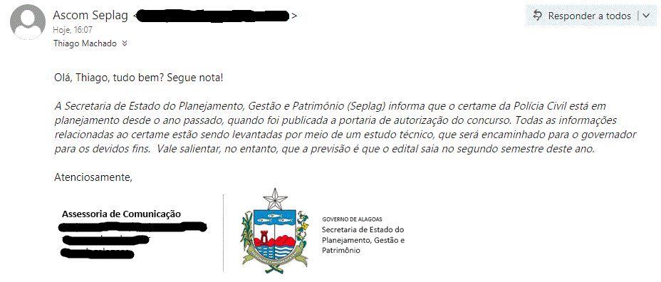 A equipe de jornalismo da Nova Concursos, entrou em contato com a Secretaria de Estado do Planejamento, Gestão e Patrimônio (Seplag) para obter maiores informações sobre o concurso PC-AL.